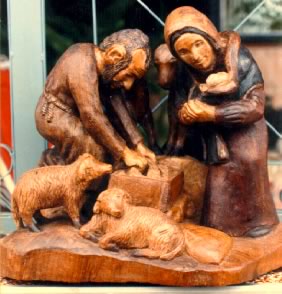"Maria carinhando menino Jesus, São José arrumando o cochino onde será colocada o menino Jesus, o animais esperando para ficar ao redor dele".